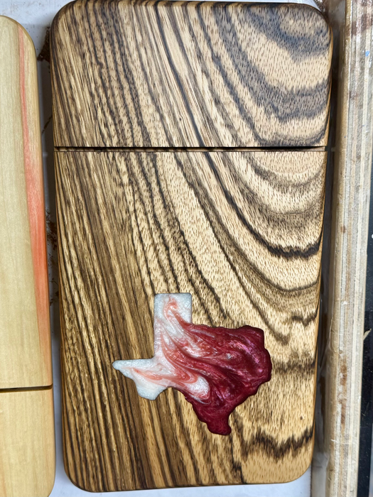 The workshop begins with you selecting your project piece from a wide variety of solid wood samples. Next, you’ll choose from our diverse range of pigments to create your own resin color palette. To make it even more personal, attendees are welcome to bring items from home to encase in their resin. For those looking to add an extra touch, we also offer optional enhancements such as locally grown and pressed flowers, exotic woods, sea shells, bullet casings, and more.